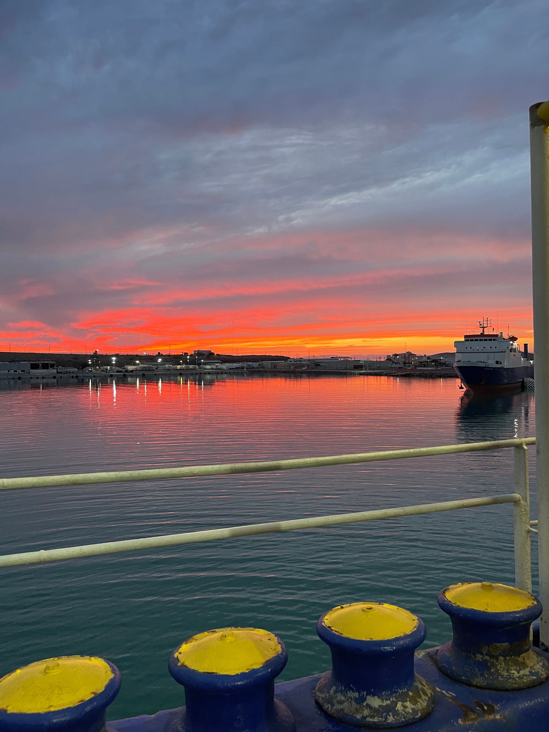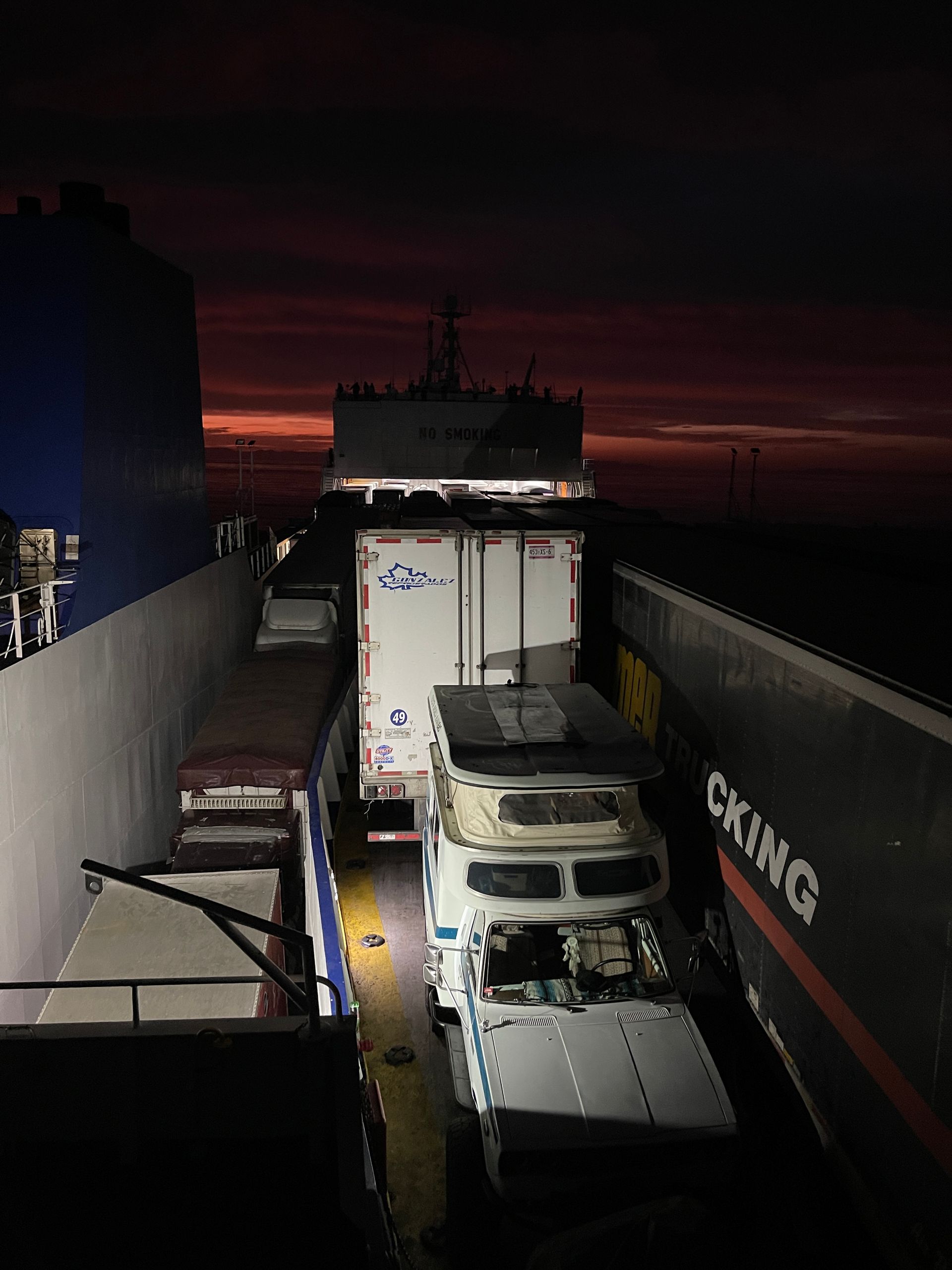 Up the Chinook goes on the ramp to the top deck. We are directed in between a breast height wall, a semi on our left, and another behind. Ahead of us is the anchor’s intimidating rope. Watching in our mirrors as the workers chain everything down, we both look at each other and hope they do the same to us ha ha. To put in perspective how similar this is to a sardine-filled can, Matthew has to get out through my door due to the closeness on his side.