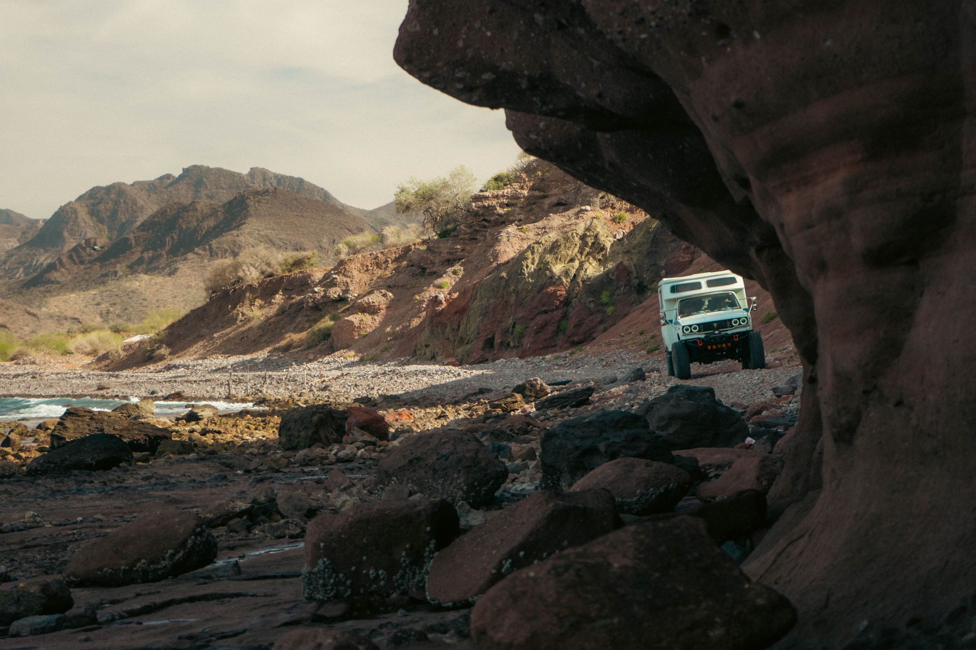 Michael goes first in his 60 series Landcruiser to check that the tide isn't too high. Now that we've made it to the ocean, the route to the beach we're aiming for is along the rocks underneath a cliff overhang. If the tide is too high, our trucks would be driving through salt water puddles which is undoubtedly NOT an option. Thankfully, the 60 series disappears around the corner and that's our queue. At this point in the drive my heart has left my chest and is surfing the perfect break beside us. All this scene needs is a paper map sprawled in my lap, and a compass hanging from Matthew's neck.