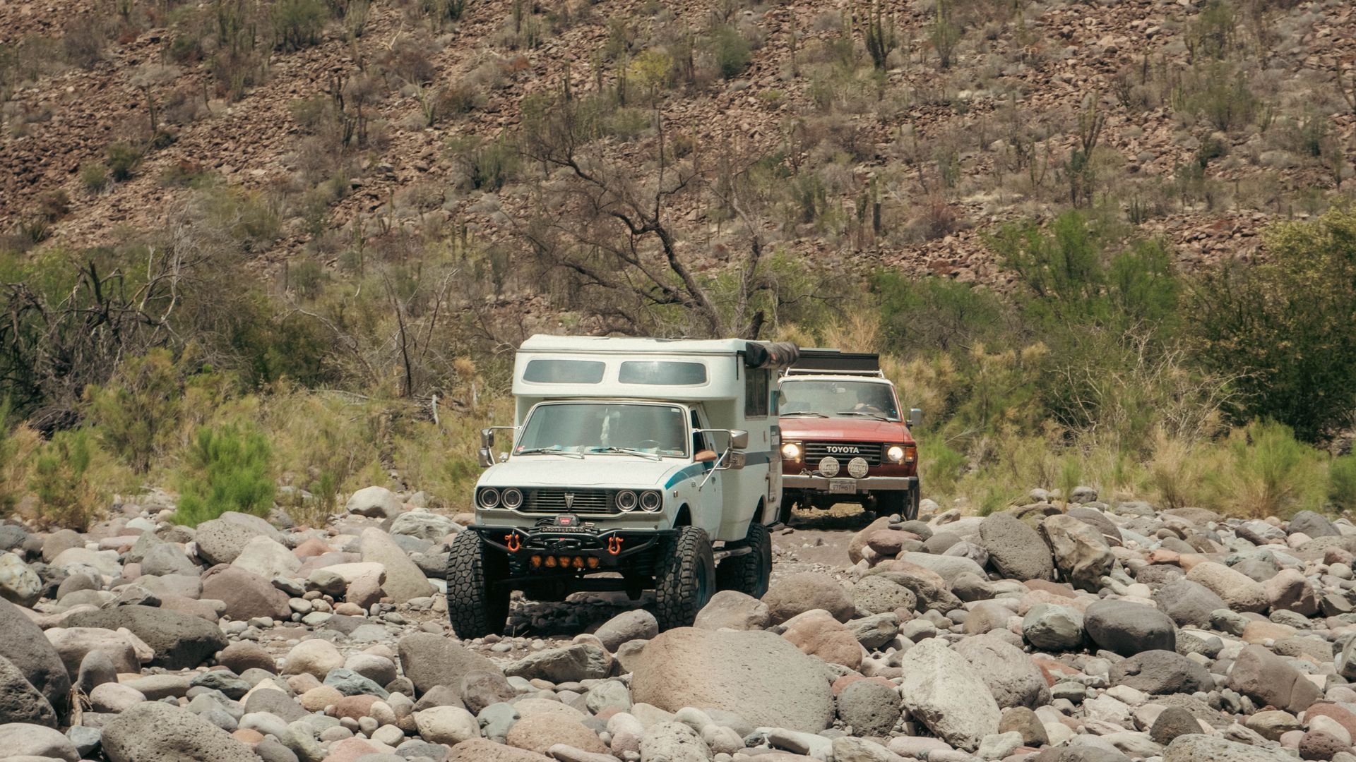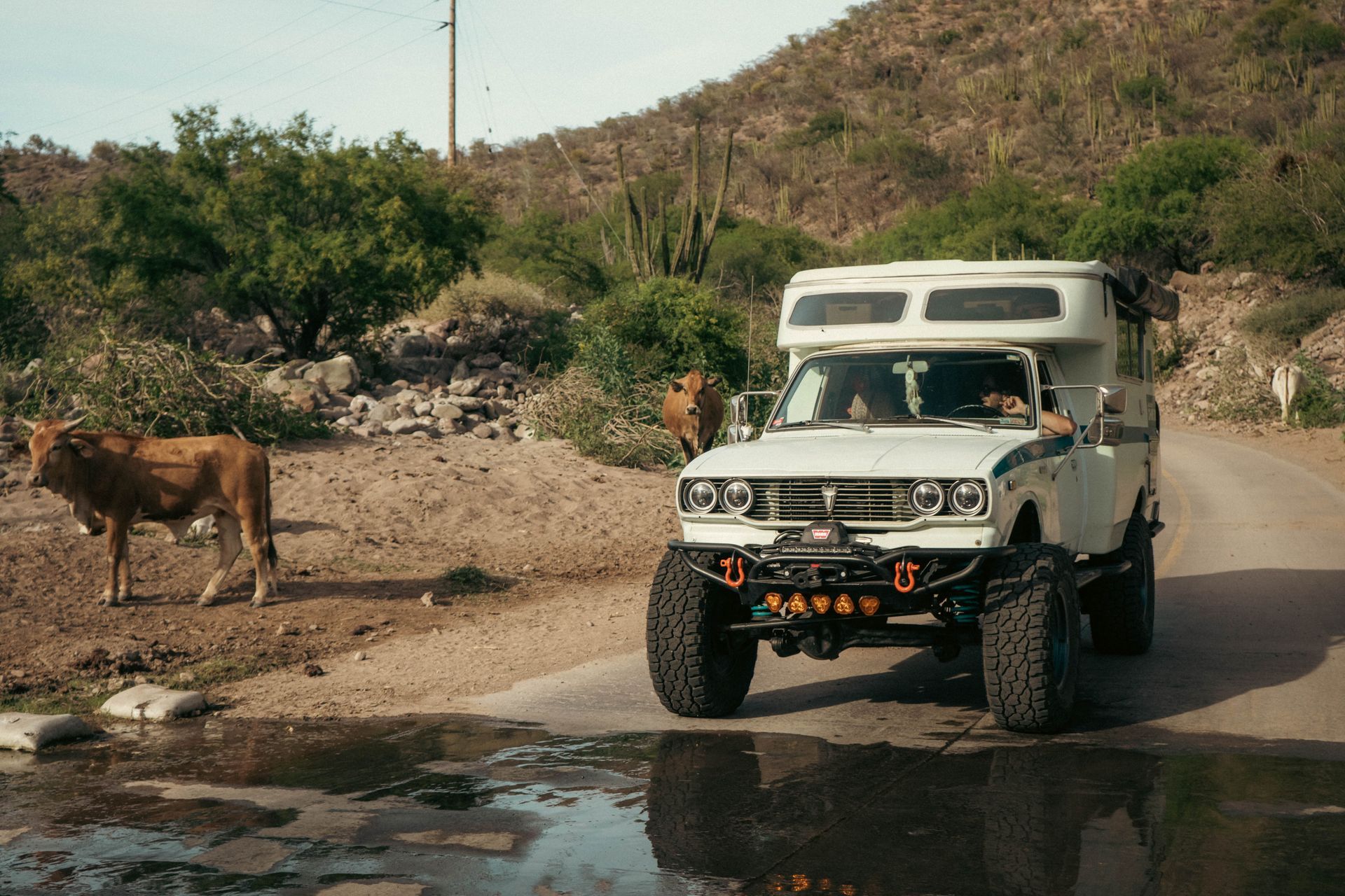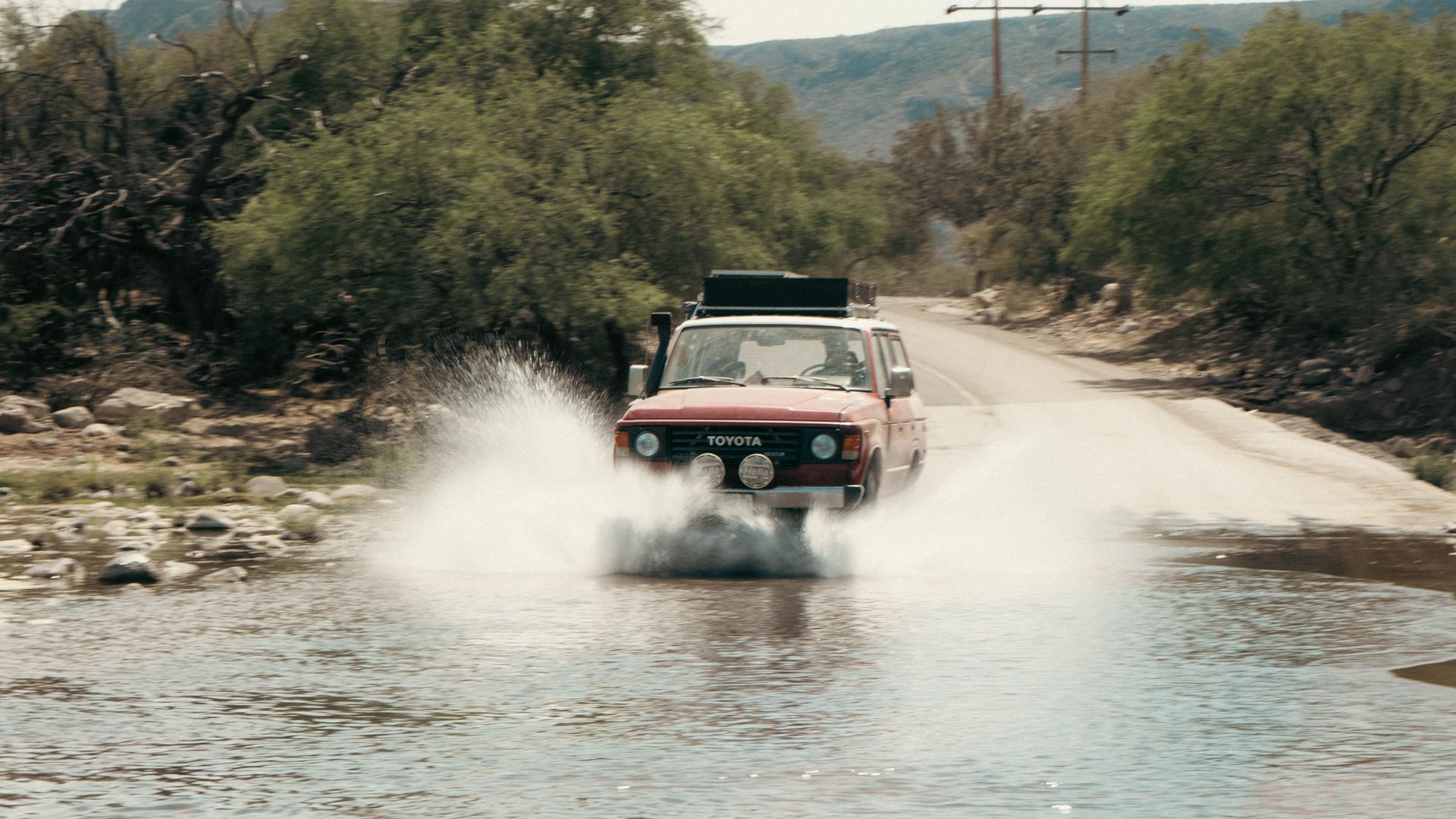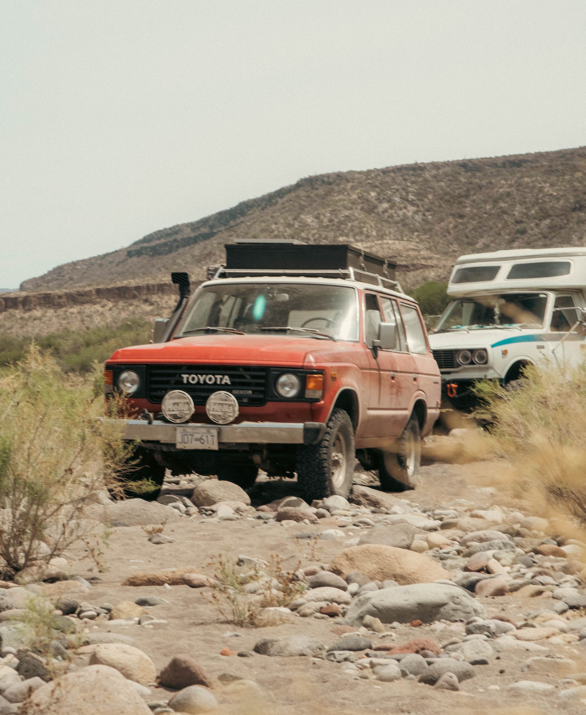 Sunday spits and hums as we climb 700 meters from sea level into the classic Baja mountainous region. But something feels different. As I reach my arm out the window, my fingertips playing with the setting sun, I notice the silence. The chinook’s exhaust echoes over the hills. A small rancho peeks over dusty hills every few kilometres, but nature owns this area. To our most pleasant surprise, as we crest over the final hill, our tires take a bath in an overflowing river. Little did we know, this would not be the last, so we hop out of the truck and imagine what it would look like during the rainy season. Most likely uncrossable. Right now, the splash is refreshing, and we enjoy the next couple that appear on the route. This entire trip, we have come across very few areas with this much water.