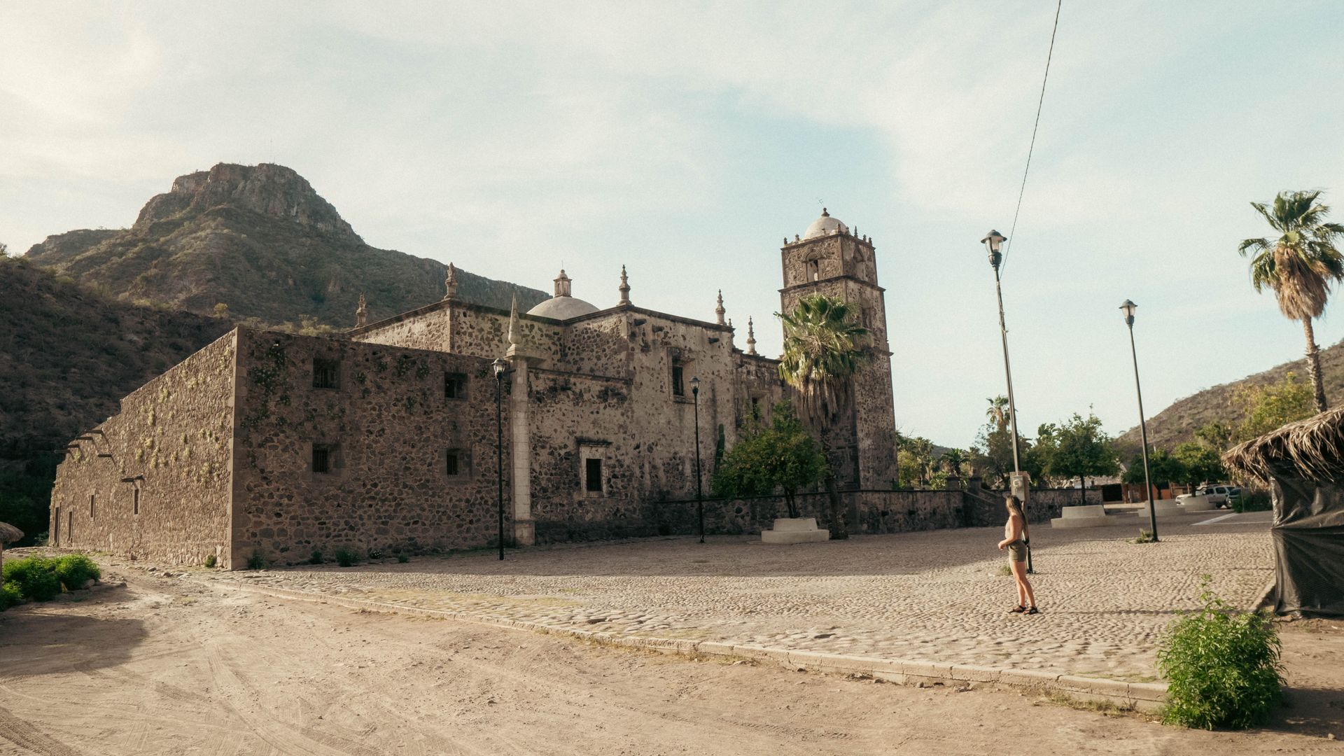 The desert flora changes vastly when we roll into town. New dark green hues cover the hillside, and plants other than cacti frame each corner. As the song of the Chinook gets turned down to low, the tires add some drums as we roll over what feels like historic cobblestone. The low tapping of the drums is harmonized with playful song birds waltzing through the flowers announcing our arrival. Around the cobblestone corner, a golden hour show spotlights the mission. All this song needs is some bells and we could sell it.