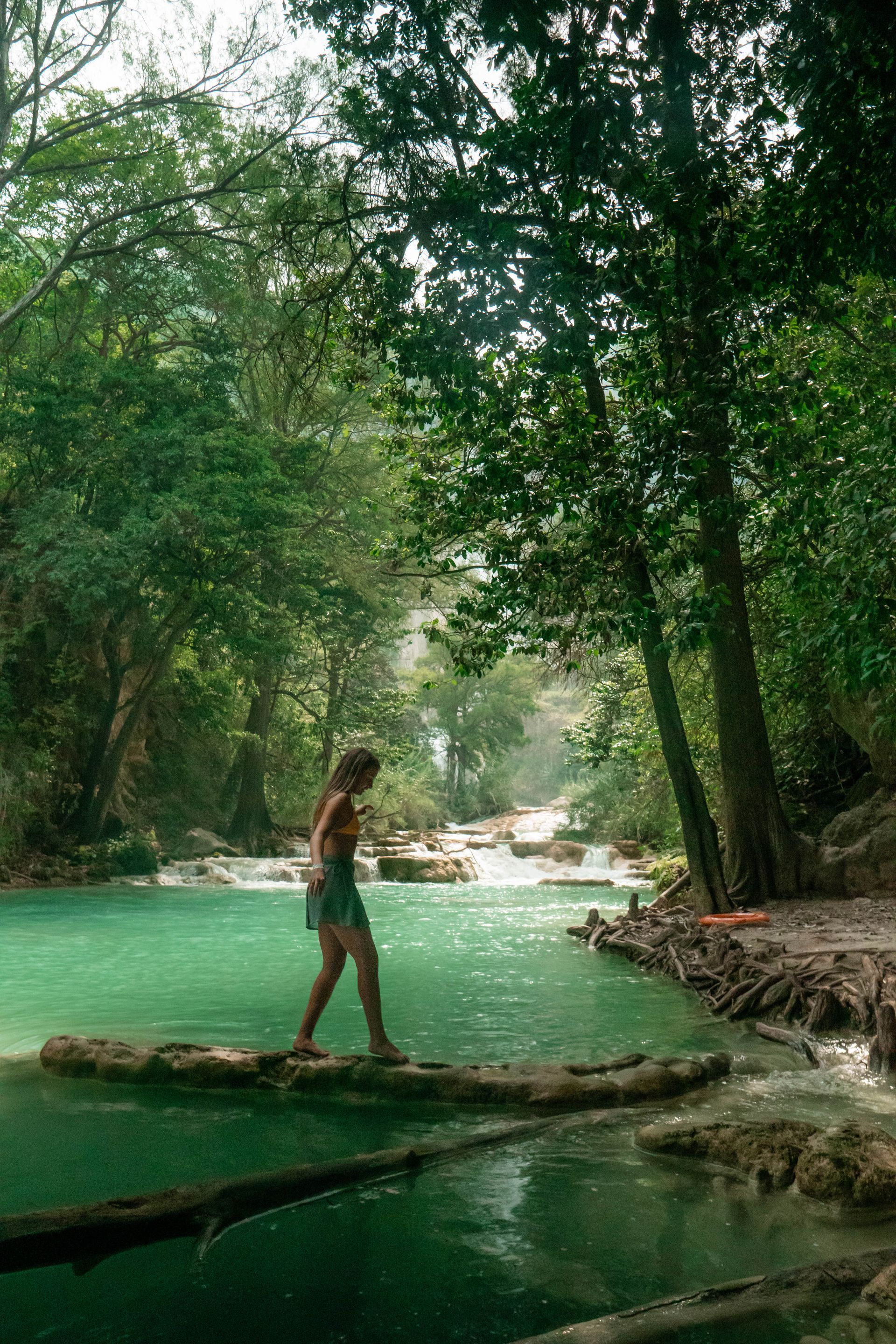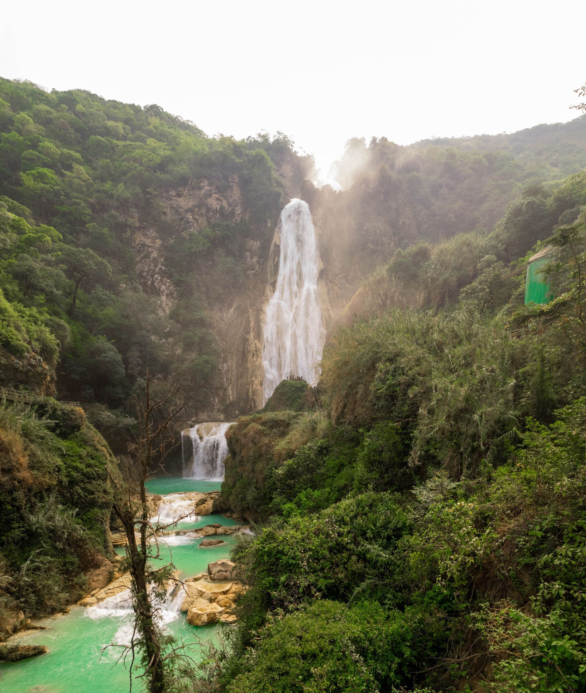 Cascada El Chifflon is only a couple kilometres up river, and he calls as we rise from a deep sleep. Our tires creep out of camp and down a cobblestone road to the entrance. One hand waves goodbye to our steed, and the other holds camera gear and towels. The tree canopy closes in, and we’re quickly surrounded by animated styles of leaves and flowers that belong on a Hawaiian shirt. We follow the river on our left, and can’t stop talking about the colour. It’s early in the morning, so the song birds are still at their chorus. Not paying any mind to the first couple waterfalls, we advise them of our return after meeting their master.